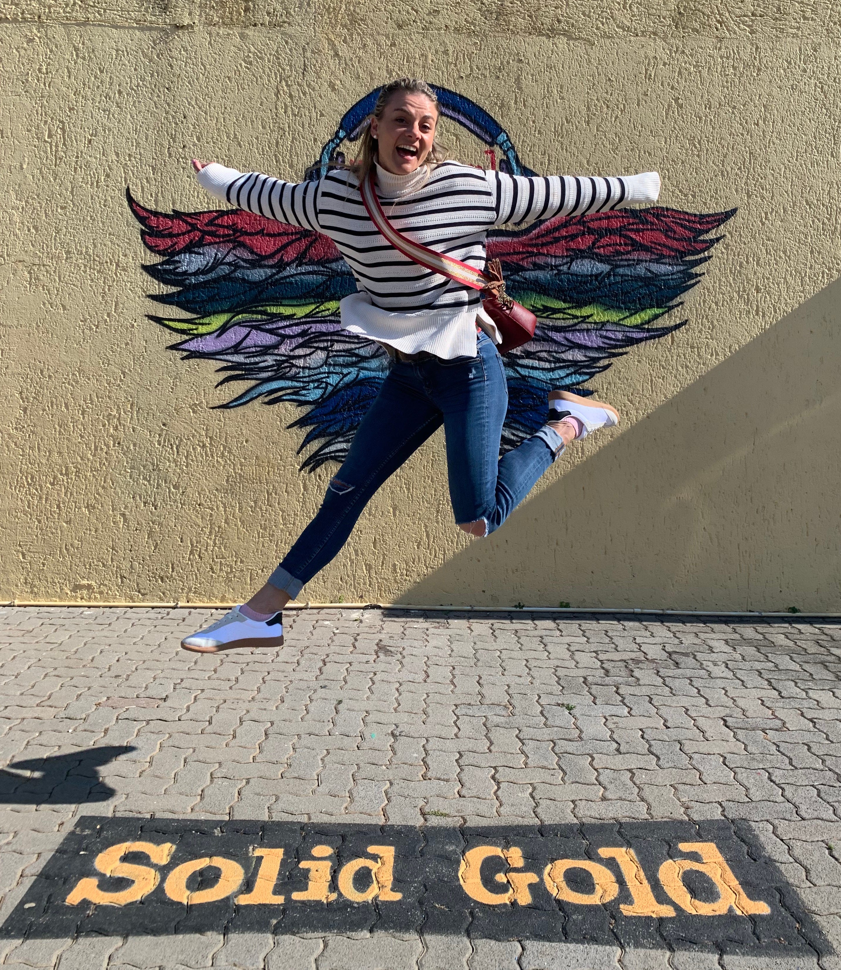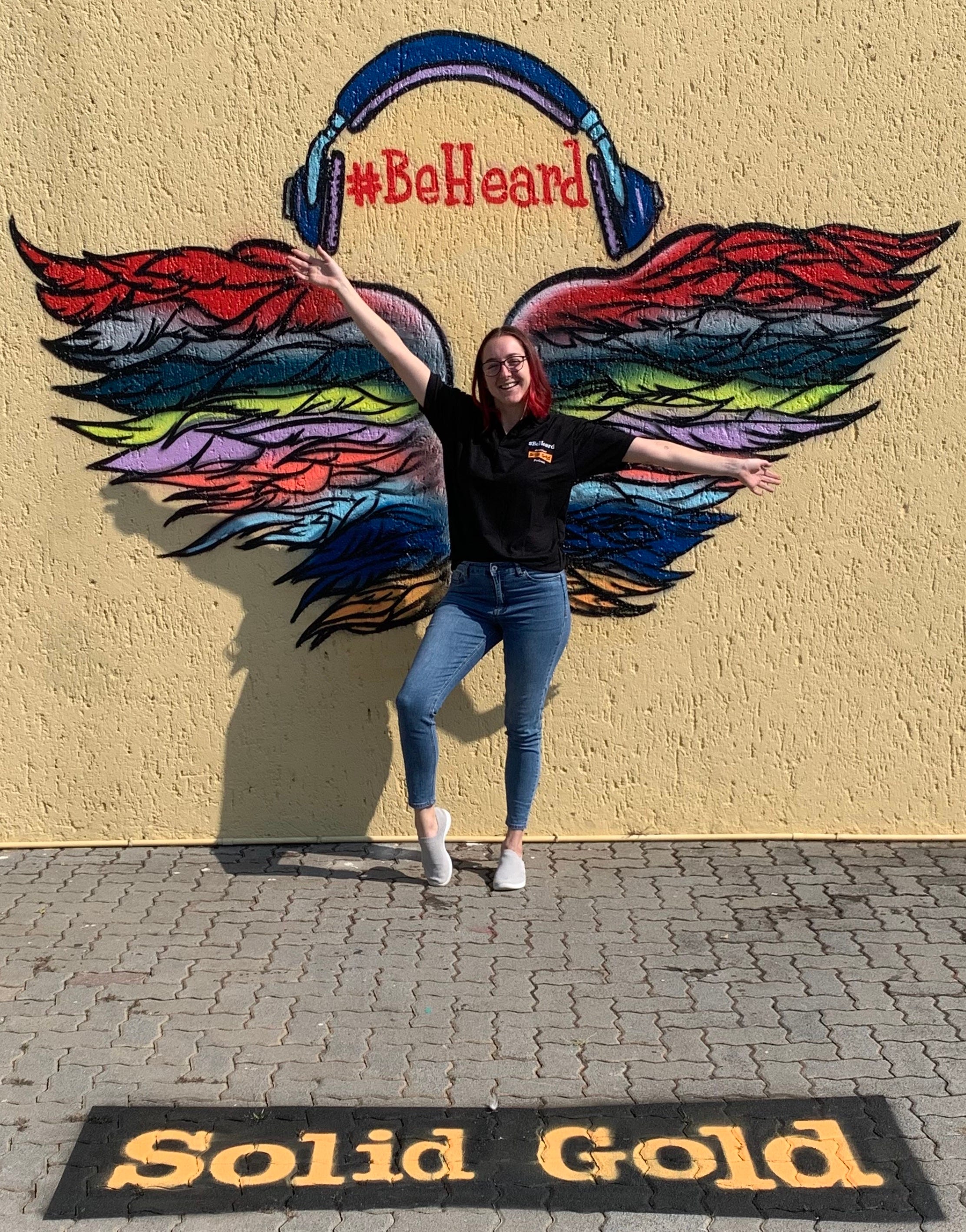 We’ve been making podcasts for a little while now, and in that time, we’ve had quite a few fabulous people visit the Creative Hub. On an outside wall of the building is a set of wings that serve as a perfect spot to strike a pose.
